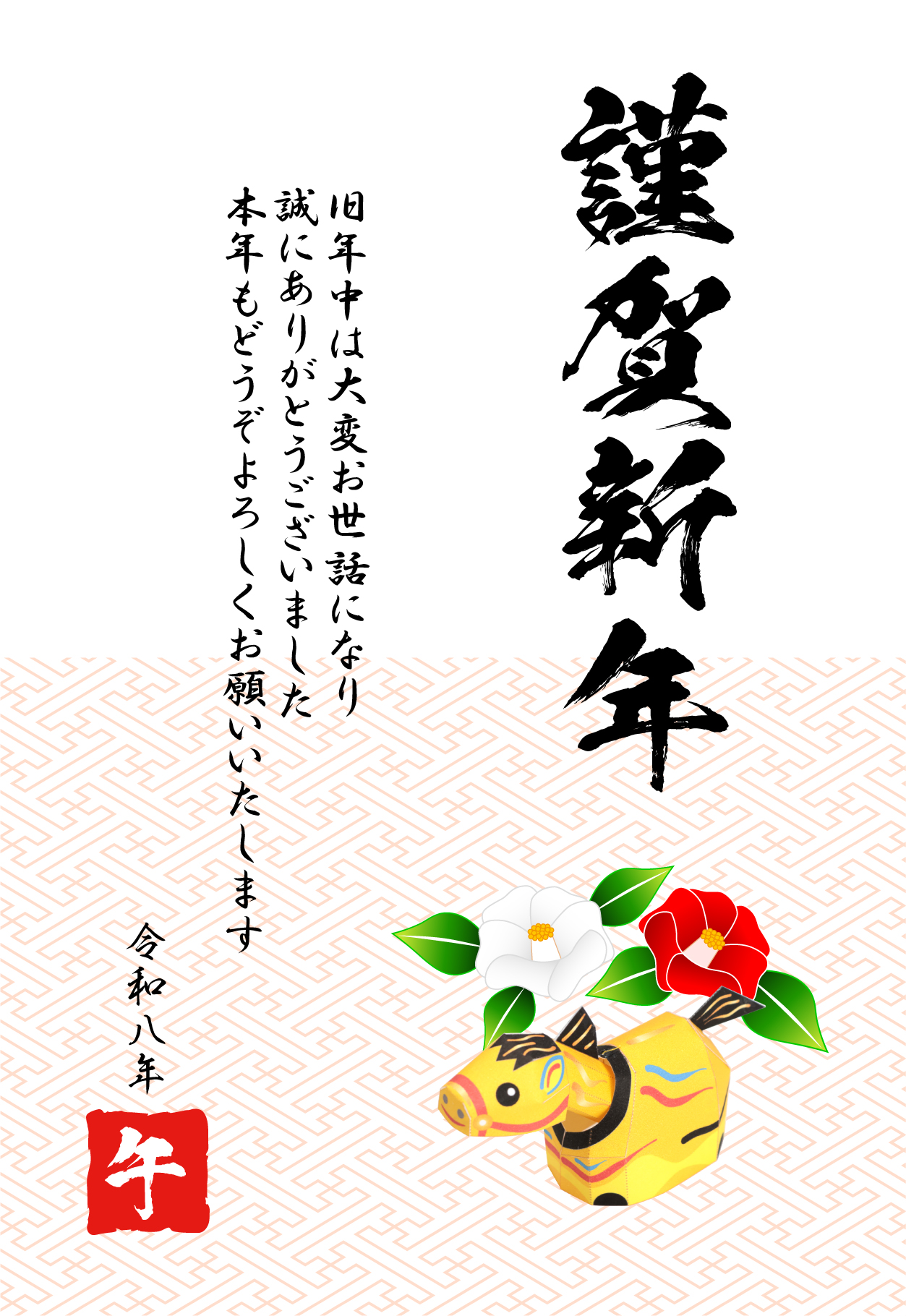 立体感のあるクラフト馬と華やかな椿の組み合わせは、個人用はもちろん、企業用の年賀状にもおすすめできる無料テンプレートです。