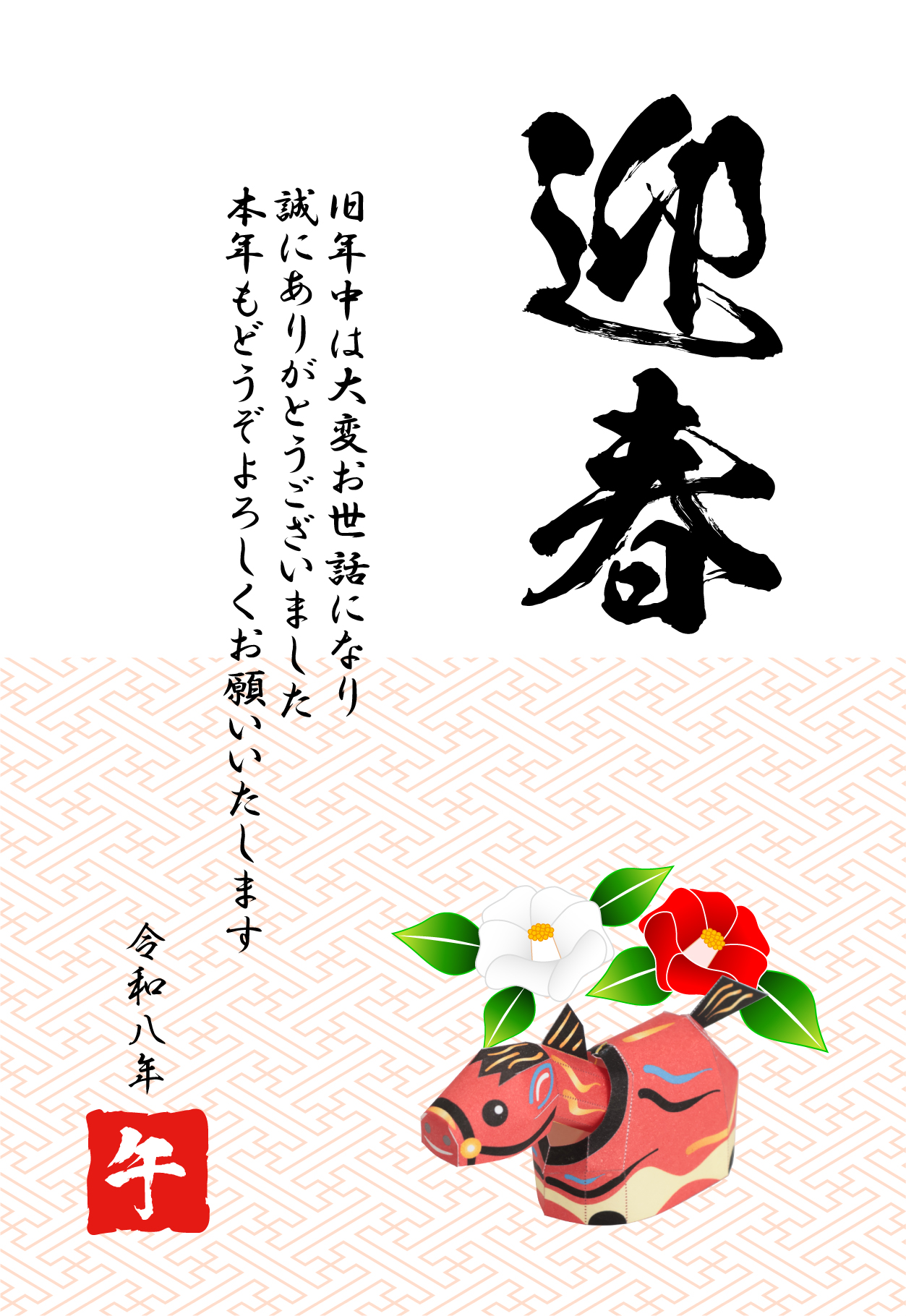 謹賀新年・迎春・賀正の賀詞を大胆にあしらった、2026年の干支にふさわしい「椿のイラストと馬のクラフト&折り紙」の年賀状で、新年のご挨拶を華やかに演出しましょう。