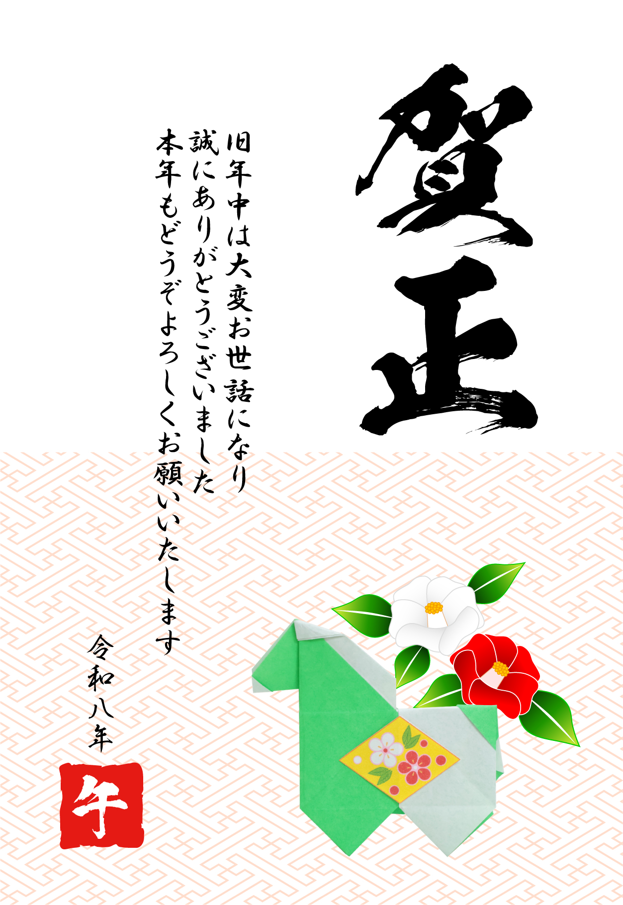 落ち着いた緑の馬の折り紙と椿の華やかさが調和した、穏やかで品のある和風年賀状です。